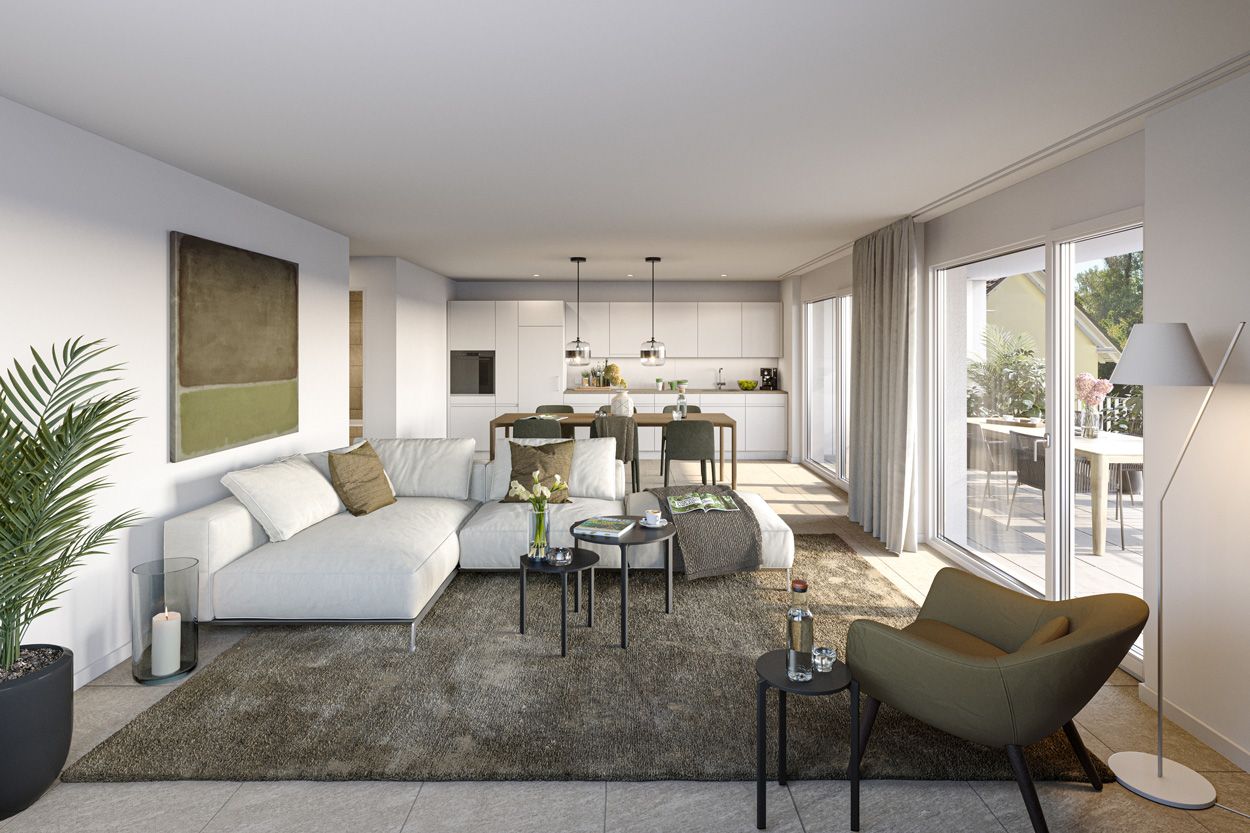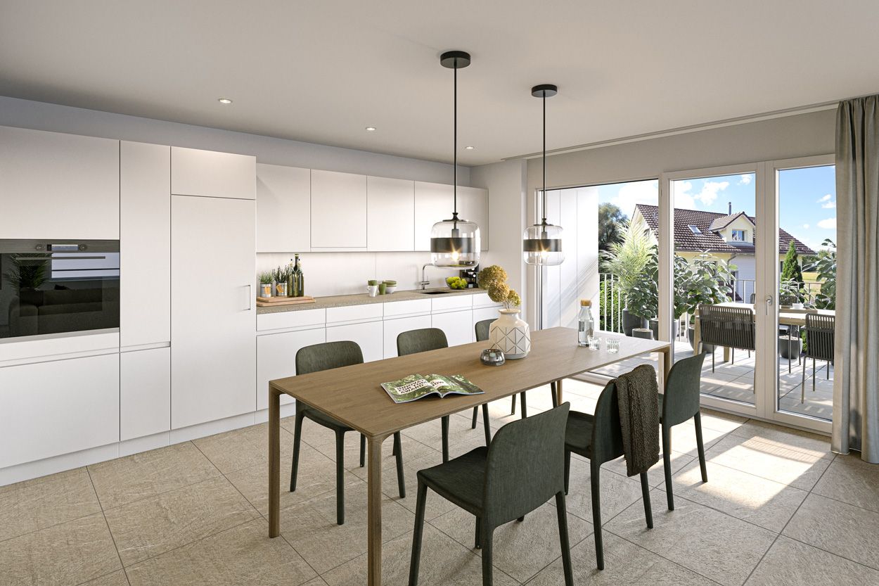 Der Wohnraum mit offener Küche und breiter Fensterfront lässt viel Licht in den Innen­raum. Die gross­zügigen Bal­kone laden zum entspannen ein.
